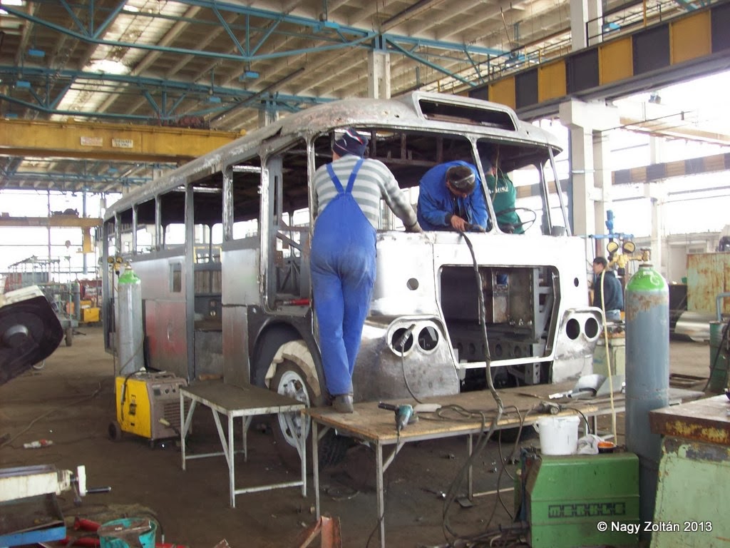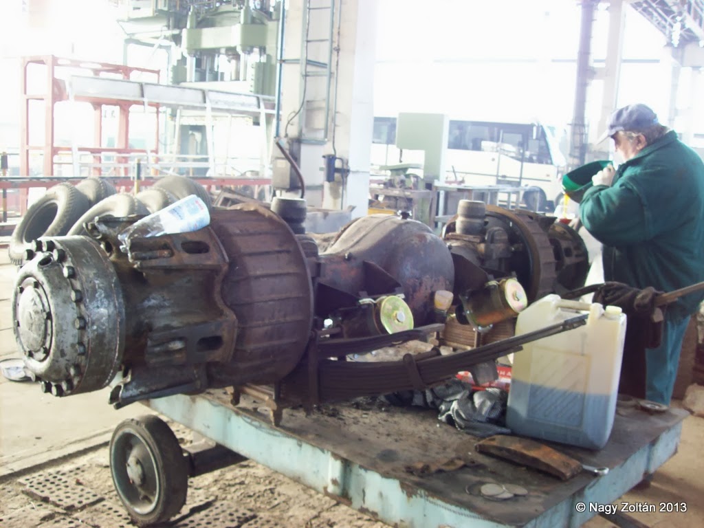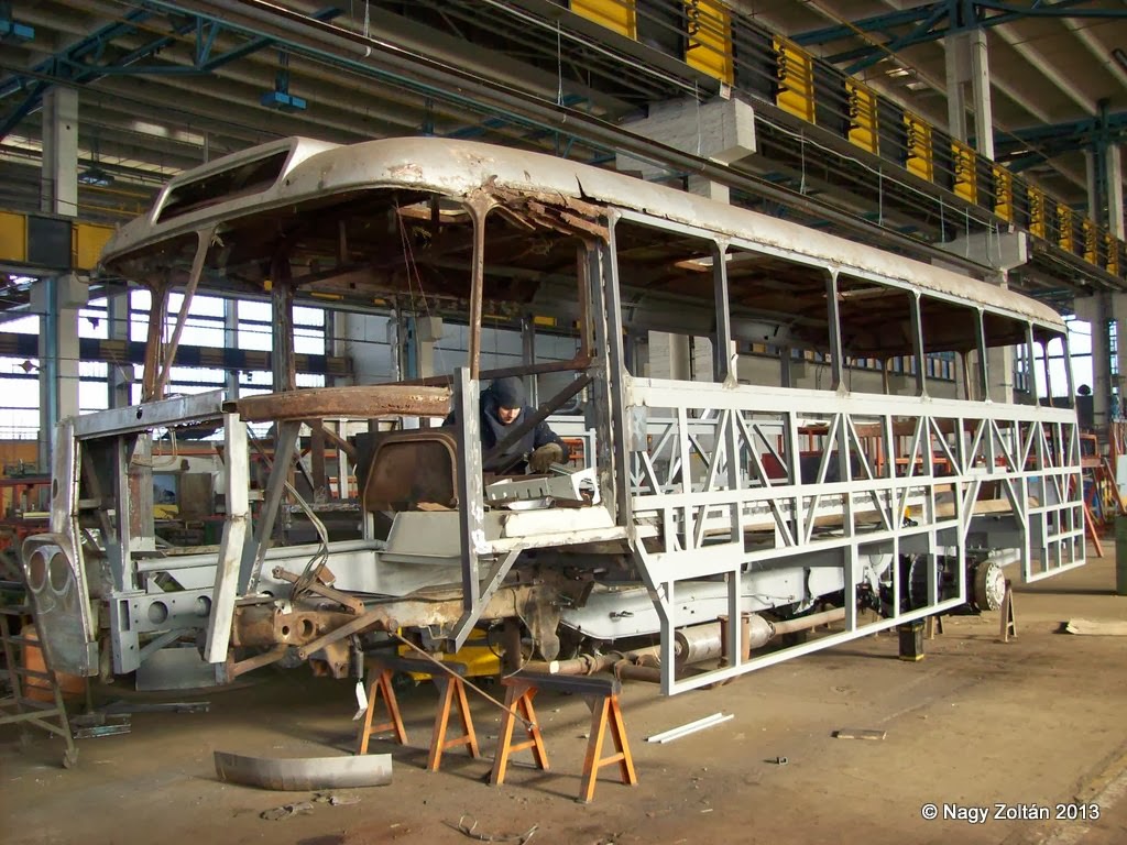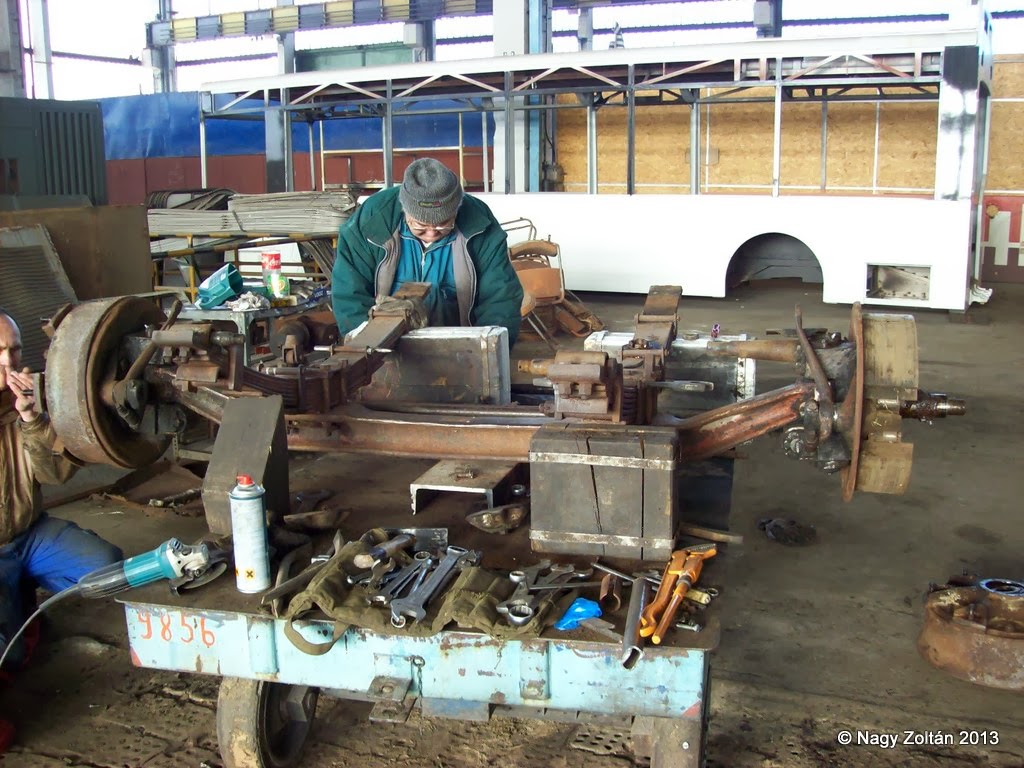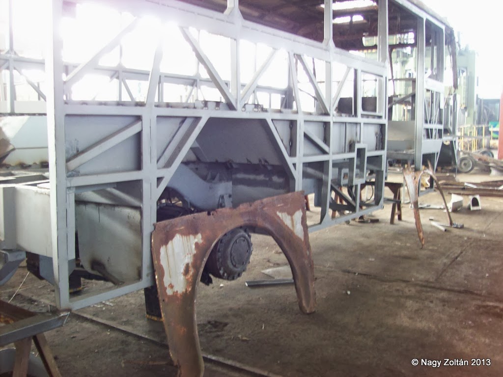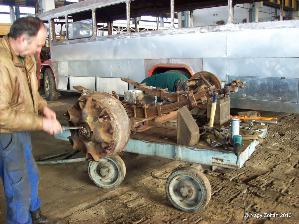| Az első futómű. A háttérben egy szintén felújítás alatt lévő Ikarus 630-as. |
